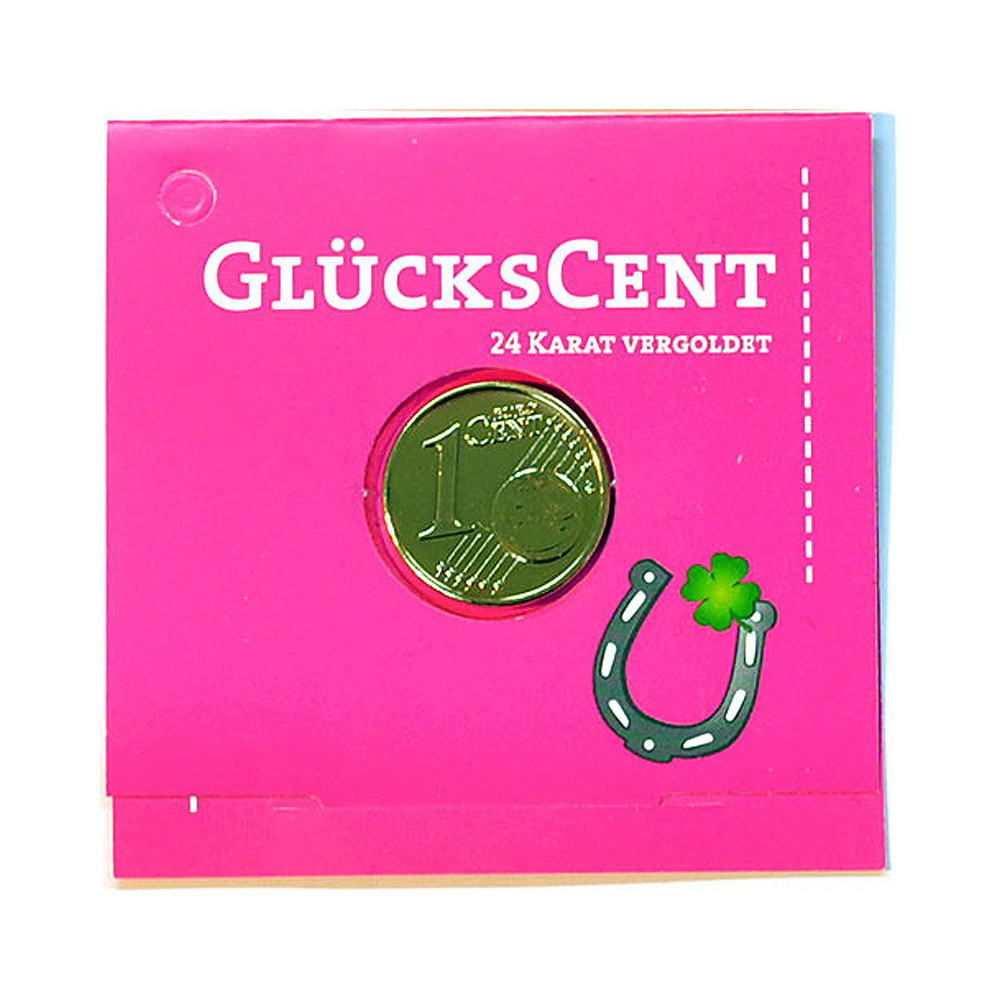 Glückscent mit 24 Karat vergoldet und auf eine Karte mit Motiv von 55 mm x 55 mm geklebt. Klappkarte auf Innenseite aufgedrucktes Zitat oder Spruch zum Thema Glück. Verschiedene Motive zur Auswahl.